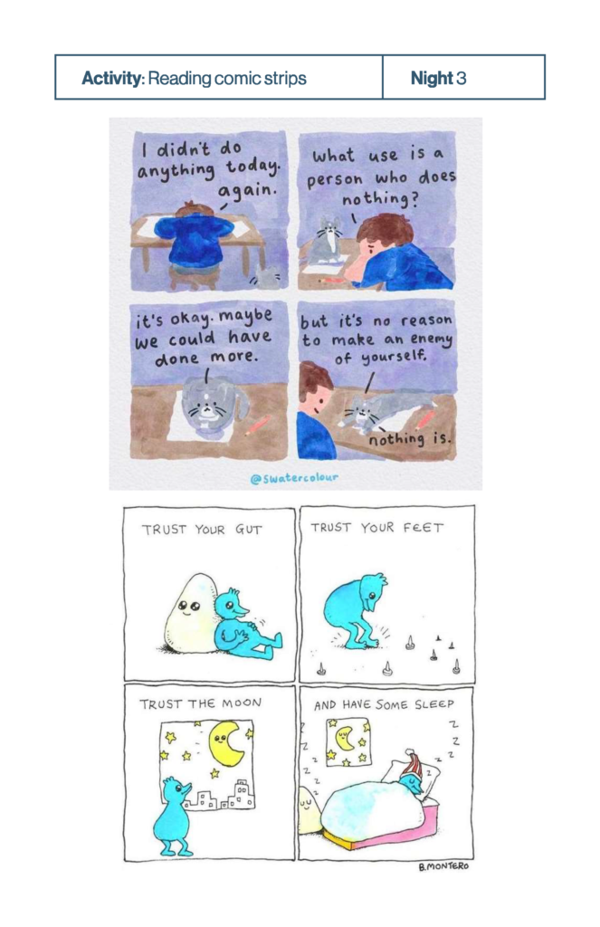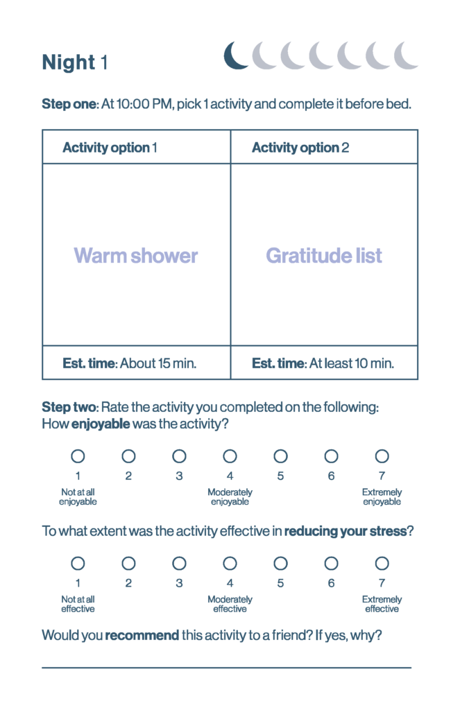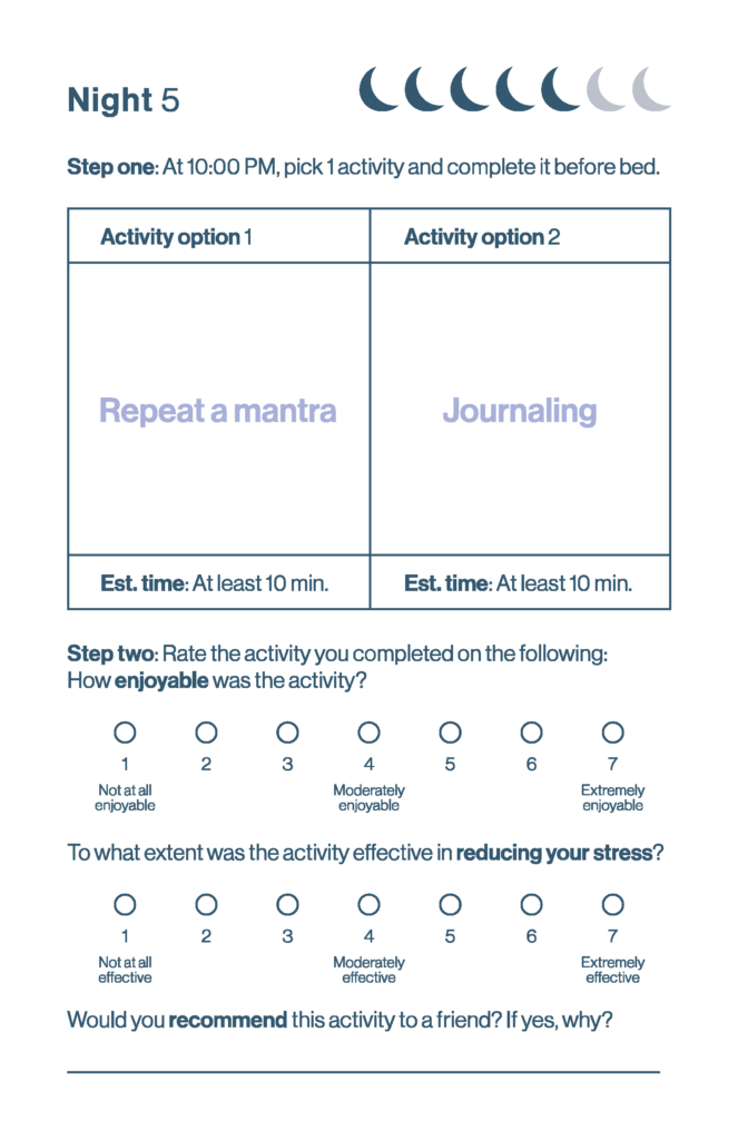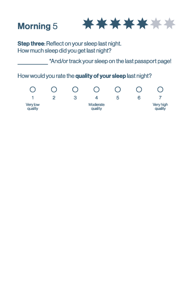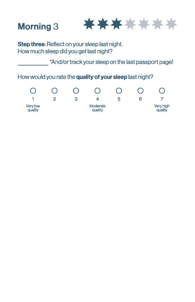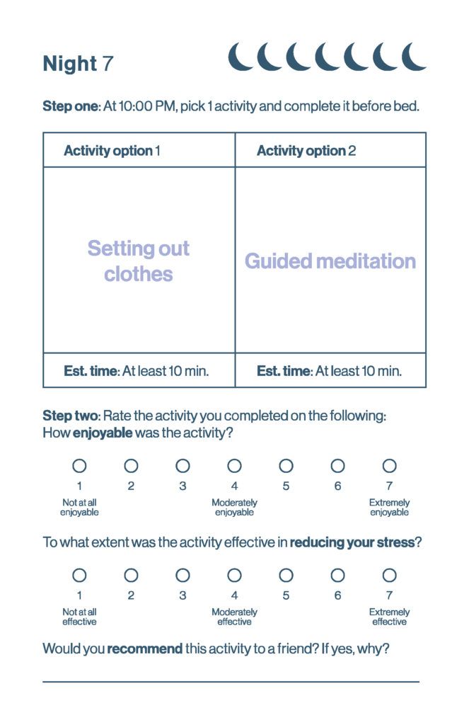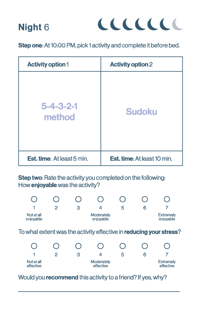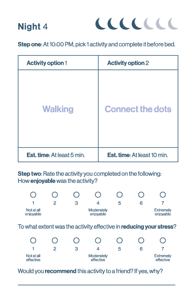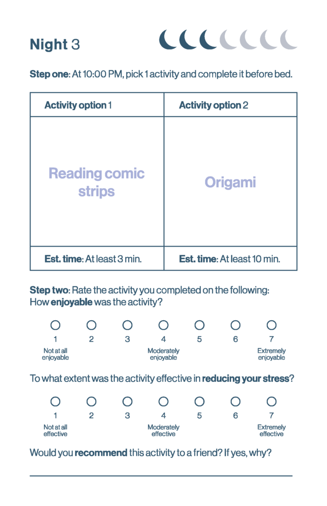 The outcome was Sleep Passport, a low-tech, tangible intervention designed to help participants replace screen-based habits with short, low-effort wind-down activities before sleep. Structured as a customizable “passport,” the toolkit enabled participants to choose from alternative activities, reflect on their effectiveness, and iteratively refine their personal sleep routines over a four-week period.